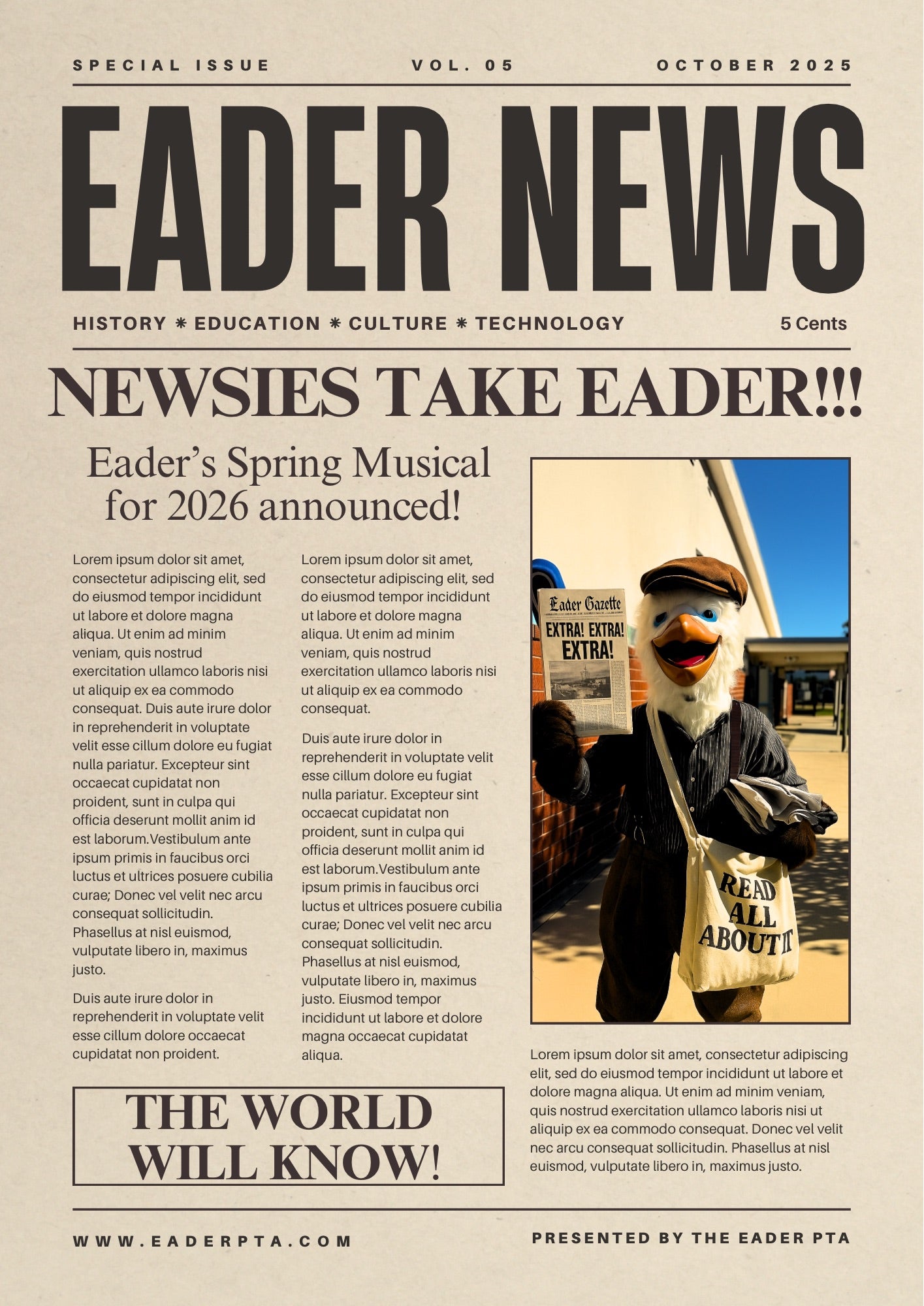 Eader Elementary is thrilled to present Disney's Newsies JR. this March! Join our talented students as they sing, dance, and "seize the day" in this high-energy musical about courage, friendship, and standing up for what's right. It's the perfect opportunity to support our school community and cheer on our amazing performers. Mark your calendars—you won't want to miss this show-stopping production!