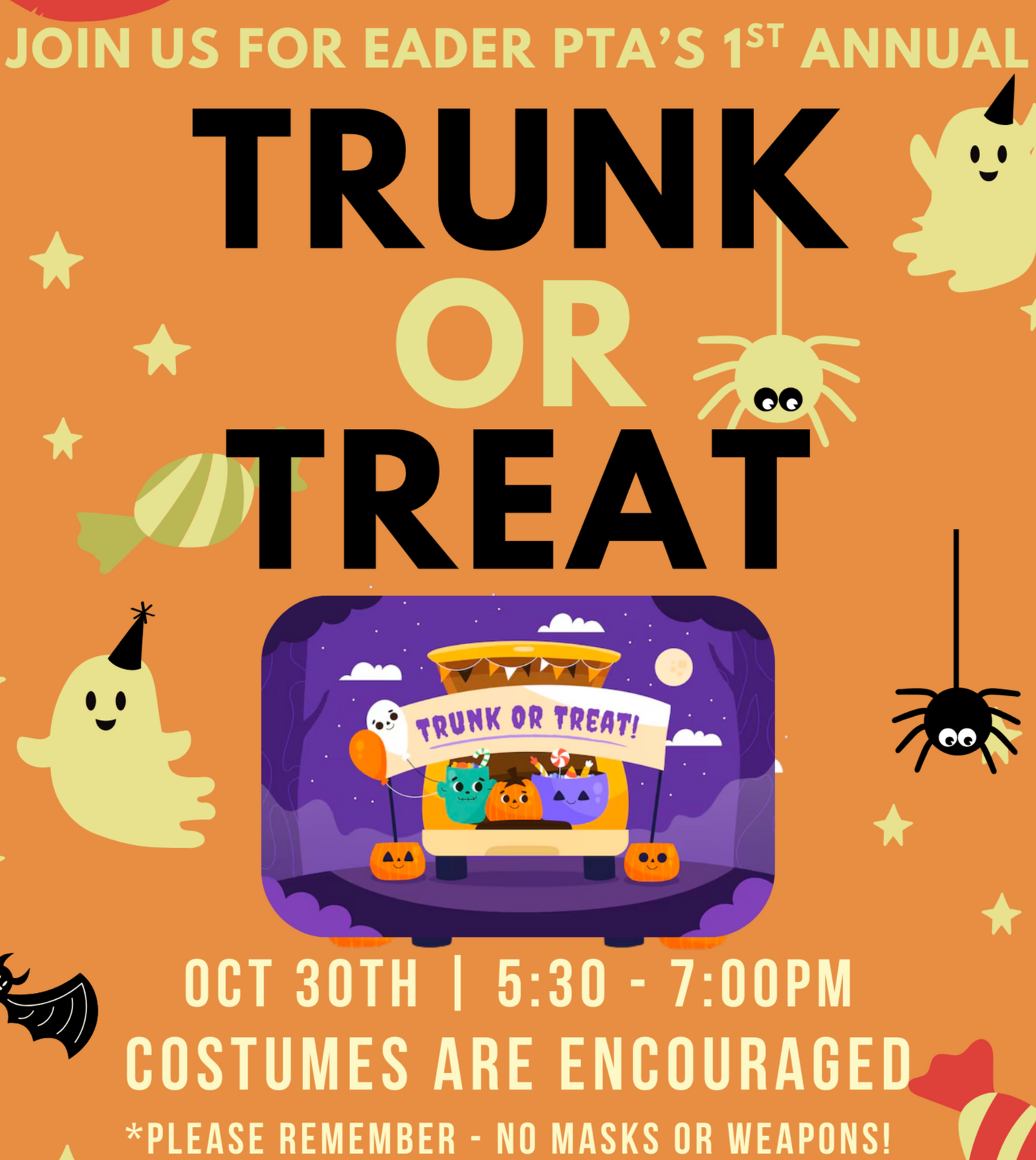 The PTA is excited to host our annual Trunk or Treat on Thursday, October 30th from 5:30–7:00 PM—and we need your help to make it amazing!